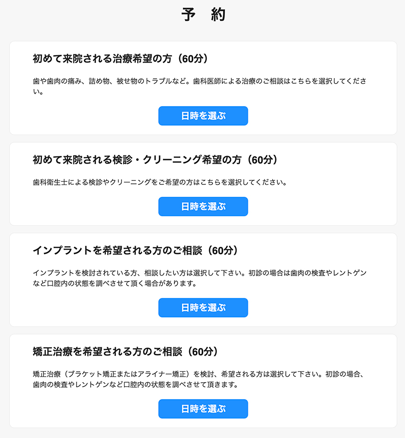 富沢歯科医院を初めて来院される患者様で、ご予約を希望され日時を決めたい方のサイトです。24時間受付(無人)しております。分かりやすい操作で予約出来ます。お電話(03-5447-5711)でのご予約は、9時30分〜18時まで月曜〜土曜(木曜、日曜、祝日はお休み)スタッフでの対応予約で承ります。